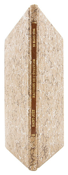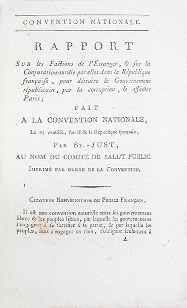 Édition originale de ce célèbre rapport, suivi du décret correspondant (p. 25 à la fin), qui annonce et justifie larrestation dHébert et de ses compagnons, intervenue dès la nuit suivante, marquant la radicalisation jacobine du printemps 1794. « Cest tout lesprit de Saint-Just qui apparaît dans ces pages, son exigence de vertu, ses principes rigides, jusquà son amour exalté pour les abstractions sociales. » Cest dans ce texte quil formule la réflexion devenue célèbre, « Tout le monde veut gouverner; personne ne veut être citoyen. Où est donc la cité ? » (p. 17). (Martin & Walter, 30717. Tourneux, 4229a). Très bon exemplaire, frais, non rogné, bien relié.