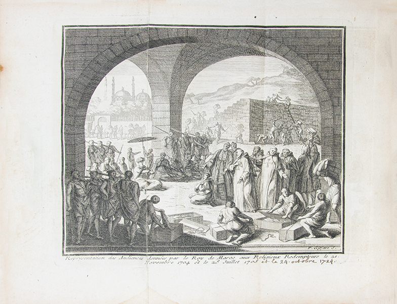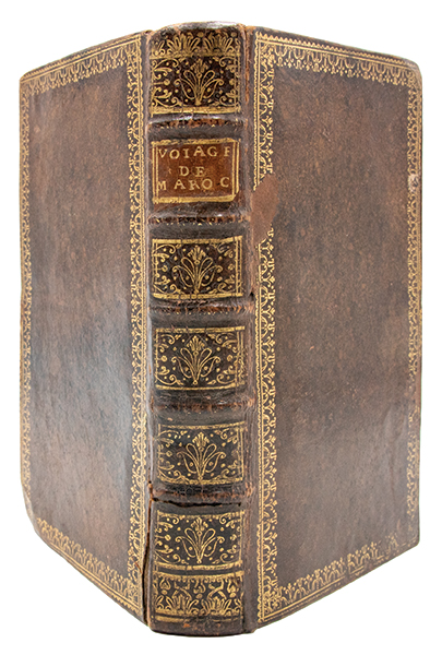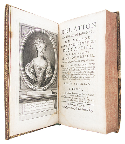 Édition originale de cet ouvrage dédié à Marie Leszczynska, reine de France, dont le portrait figure en frontispice. Planche dépliante gravée par Giffart représentant les audiences données par le roi du Maroc aux religieux rédempteurs en 1704, 1708 et 1724. Témoignage capital sur laction diplomatique et humanitaire des pères trinitaires en Afrique du Nord au début du XVIII siècle. Louvrage rapporte avec précision la mission conduite au Maroc et en Algérie par Jean de La Faye, Denis Mackar, Augustin dArcisas et Henry Le Roy, envoyés afin de négocier le rachat de captifs français détenus par les Barbaresques. Le récit, à la fois circonstancié et documentaire, éclaire les pratiques diplomatiques, les conditions de captivité et les modalités concrètes des rachats. Les douze dernières pages fournissent une liste nominative détaillée des captifs libérés, document de première importance pour lhistoire sociale, maritime et méditerranéenne. (Chadenat, n°680. Gay, n°465). Accrocs de cuir et épidermures à la reliure. Quelques piqûres. Exemplaire, relié à l’époque.