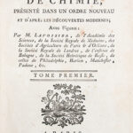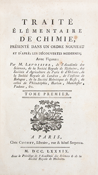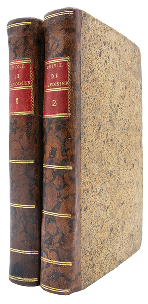 Edition originale, second tirage (on ne connaît que quelques exemplaires du premier tirage). Dans cet ouvrage fondateur de la chimie moderne, Lavoisier expose sa découverte sur la nature de l’air et met fin à la théorie du phlogistique de Stahl en démontrant que toute combustion résulte d’une réaction chimique d’un corps avec l’oxygène de l’air. L’illustration se compose de 2 tableaux dépliants et de 13 planches dépliantes gravées en taille-douce par Marie-Anne Pierrette Paulze Lavoisier, femme de l’auteur et élève de David. Ce second tirage se distingue du premier, en particulier, par l’ajout des « Tables à l’usage des chimistes » (p. 559-591), d’une Table des matières (p. 592-619) et de « l’Extrait des registres de l’Académie royale des sciences » (p. 620-653) confirmant l’adoption officielle de la nomenclature lavoisienne. (Blake, p. 258. Duveen & Klickstein, n° 154. Martin & Walter, III, 19848. Poggendorff, I, col. 1392-1394). Rousseurs et quelques auréoles éparses plus soutenues dans le coin supérieur des planches en fin de volume. Bon exemplaire, bien relié à l’époque.
