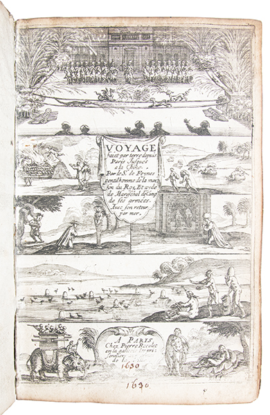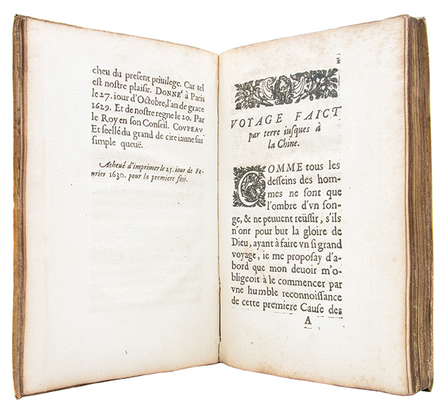 Edition originale de la plus grande rareté, ornée dun remarquable titre-frontispice gravé sur cuivre figurant une allégorie du voyage et des continents. Henri de Feynés (ca 1573-1647), gentilhomme dauphinois de la maison du roi, y relate lun des voyages les plus étendus et les plus précoces accomplis par un Français jusquen Chine. « Ce voyage dun gentilhomme de la cour dHenri IV jusquà Canton, entre 1606 et 1609, constitue un événement majeur dans lhistoire des voyages français au XVIIe siècle » (Dirk van der Cruysse). Il quitte la France en 1606; chargé par Henri IV dune mission dinformation officieuse, et voyageant sous le nom de « comte de Monfart », il emprunte un itinéraire exceptionnel passant par Venise, Alep, Bagdad et Ispahan, à la cour de Shah Abbas Ier, puis par Ormuz, lInde et Goa, avant Malacca, les Moluques, Macao et Canton. Il y décrit le commerce de la soie et des porcelaines, observe la pêche pratiquée à laide doiseaux dressés, les cormorans, sétonne des pieds bandés des femmes de qualité et mentionne un breuvage encore inconnu en France, le café, quil nomme « cahayette »; témoignage dautant plus précieux quil faut attendre la fin du XVIIe siècle pour voir dautres Français parvenir jusquen Chine. Le retour seffectue par mer autour du cap de Bonne-Espérance. Arrêté à Lisbonne en 1611, soupçonné despionnage, il y est libéré en 1613 grâce à lintervention du duc de Mayenne. Rédigé entre 1606 et 1608 dans un style précis et résolument laïque, le texte constitue une source de premier ordre sur la Perse safavide, lEmpire moghol sous Jahangir, les établissements portugais dAsie et les premières tentatives françaises de pénétration commerciale en Extrême-Orient. Une traduction anglaise anonyme parut à Londres dès 1615 sous le titre « An Exact and Curious Survey of all the East Indies ». (Cordier, ‘Bibliotheca Sinica’, col. 207. Chadenat, 634. Van der Cruysse, ‘Le Noble Désir de courir le monde’, 2002, p. 28-30. Lach & Van Kley, ‘Asia in the Making of Europe’, III, 1, p. 401. Lust, ‘Western Books on China’, n° 47). Provenance: « J’appartiens à Monsieur de La Leu [à] Avesnes » avec ex-libris manuscrit à l’époque sur la première garde blanche. Quelques taches ocre à la reliure. Quelques rousseurs éparses. Très bon exemplaire, grand de marge, bien conservé dans sa première reliure de vélin doré.