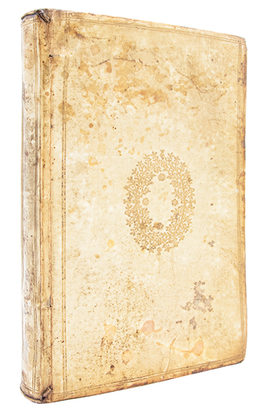 In-8 (178 x 112 mm), vélin ivoire souple, dos lisse orné d'un décor en long de double filet doré en encadrement, plats ornés au centre d'une couronne de lauriers dorés dans un encadrement de double filet (reliure de l'époque), (1) f. de titre-frontispice, (16), 212 pages.